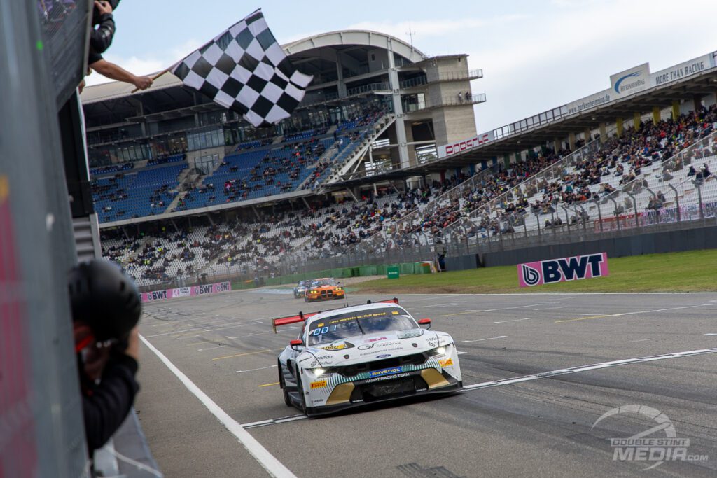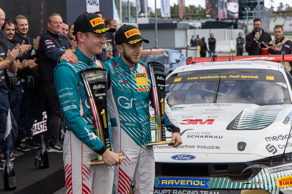 So geht das Schaulaufen der Champions 2025 standesgemäß mit einem Sieg zu Ende. Finn Wiebelhaus und Salman Owega gewinnen für das Haupt Racing Team am Sonntag in ihrem Ford Mustang GT3 im 3M Scharnau Design vor Tim Zimmermann und Leyton Fourie im BMW M4 GT3 von FK Performance und Nico Hantke/Denis Bulatov im Scherer Sport PHX Audi R8.
