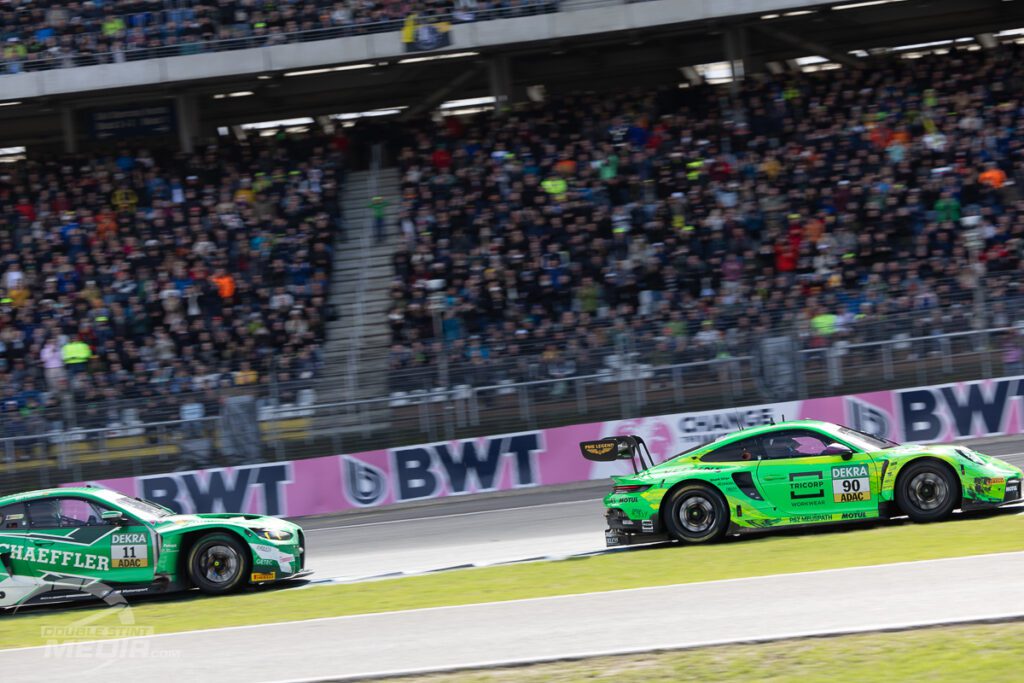 Preining entledigt sich Kalender in der folgenden Runde durch den ersten Pflichtboxenstopp. Ihm folgen Bortolotti und Gounon. Preining kommt bequem vor Wittmann auf die Strecke zurück, wären da nicht die kalten Reifen. Der Fürther holt mit Siebenmeilenstiefeln auf und kassiert den Porsche eingangs Motodrom, während nun Scherer und Schuring pitten. Manthey hat die flinkeren Finger und die beiden tauschen die Plätze. Feller zieht nun auch an Preining vorbei. Kalender und Paul kommen zum Stopp. Vorne genießt Magnus weiterhin den Platz an der Sonne, hinter ihm die Meisterschaftskandidaten Güven, Aitken, Pepper, Auer, Engel innerhalb von fünf Sekunden. Baert dahinter pittet. Der Abstand der ersten vier Titelanwärter ist auf 2,5 Sekunden zusammengeschrumpft, Engel zwei weitere Sekunden dahinter. Luggi Auer versucht den Undercut, vorne rechts klemmt es kurz. Wittmann schnupft den AMG GT3 #22 problemlos auf, seine Reifen sind ja bereits im Arbeitsfenster. Die nächste Runde sieht Leader Gilles Magnus und Jack Aitken beim Service, während Güven, Pepper und Engel jeweils zwei Sekunden auseinander liegen und am Ende der nächsten Runde reinkommen müssen, denn so langsam schließt sich das Boxenstoppfenster. Ein Abziehbild der vorherigen Runden: Wittmann schnappt sich Aitken in der Anfahrt zur Spitzkehre, da bringt auch das Weaving von Aitken nicht genug Temperatur in die Pirelli-Slicks. Jetzt kommen Güven, Pepper und Engel rein: Bei Güven dauert es links etwas länger, aber er kommt vor Engel raus, der sich vor Pepper setzen kann.