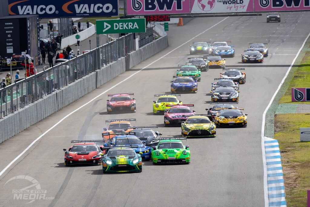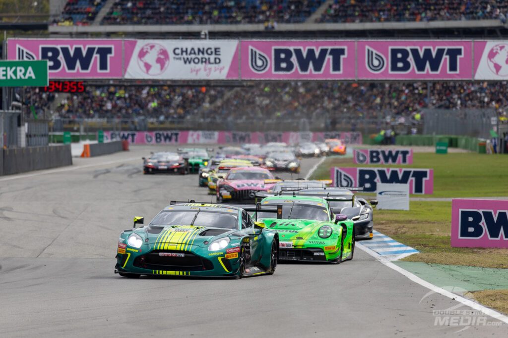 Der Start bleibt nicht ganz ohne Zwischenfall, als Ben Green und René Rast sich berühren, aber Rast fängt den M4 mit all seiner Routine wieder ein. Auch die Ameisenkurve wird von den Akteuren sauber durchfahren. Rast hat einen guten Run auf Güven und setzt sich schon in der Parabolika vor den Türken. Dieser setzt aber in der Spitzkehre gleich zum Konter an, bremst aber zu spät und zwingt Rast somit – ohne Feindkontakt – auch auf eine weite Linie. Dahinter balgen sich Gounon und Pepper, zwischen diesen Duellen liegen die Emil Frey Ferrari von Green und Aitken. Gounon ist auch etwas zu spät auf der Bremse und trifft den unbeteiligten Green, der seinerseits mit Schubert BMW von Rast kollidiert, der von ganz außen wieder nach innen will, doch mit drei Autos neben ihm ist das Drama vorprogrammiert. Als Rast quer zur Fahrtrichtung steht, knallt ihm auch noch Vermeulen auf’s Rad – am blauen BMW #31 gibt die Radaufhängung nach und der erste Titelkandidat ist draußen! Safety Car!