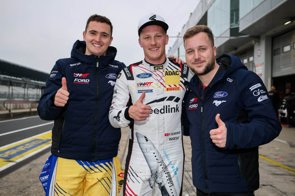 Die Bedingungen sind Eifel-typisch. Es fisselt, wie man hier sagt. Soll heißen, es gibt einen leichten Nieselregen, nix halbes und nix ganzes. Das macht Rennfahren schwierig. Zu nass für Slicks, zu trocken für Regenreifen. Im Qualifying gibt es allerdings noch bessere Verhältnisse. Entsprechend sind die Bestzeiten superb. Am Ende der 90-minütigen Session stehen zwei HRT Mustang GT3 in der ersten Reihe. Fabio Scherer stellt das Auto mit der #9 mit einer verdammt schnellen 7:48.717 min. auf die Pole. Daneben der ausgewiesene Ringexperte Frank Stippler im Mustang #6 (7:52.039 min.). Das sind mega gute Zeiten.